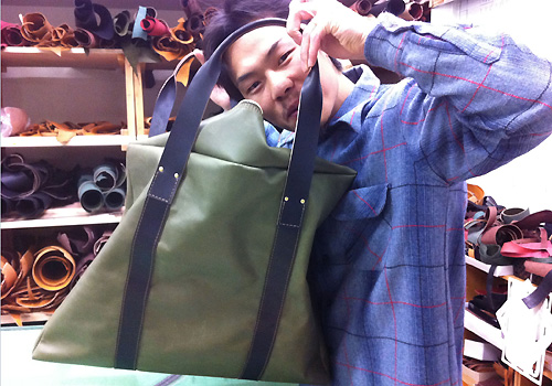 試作のカバンとおどけるクマさん