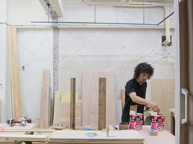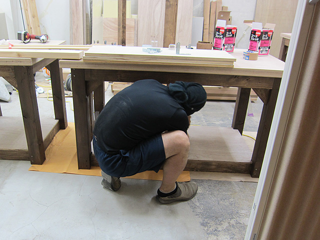 仙台店のみんなの様子はというと、只今鞄制作用の作業台を制作中。