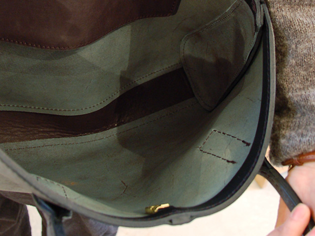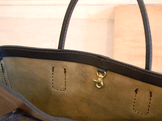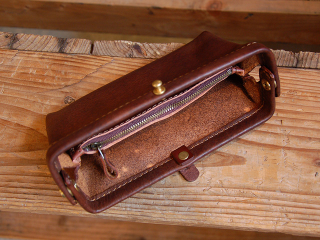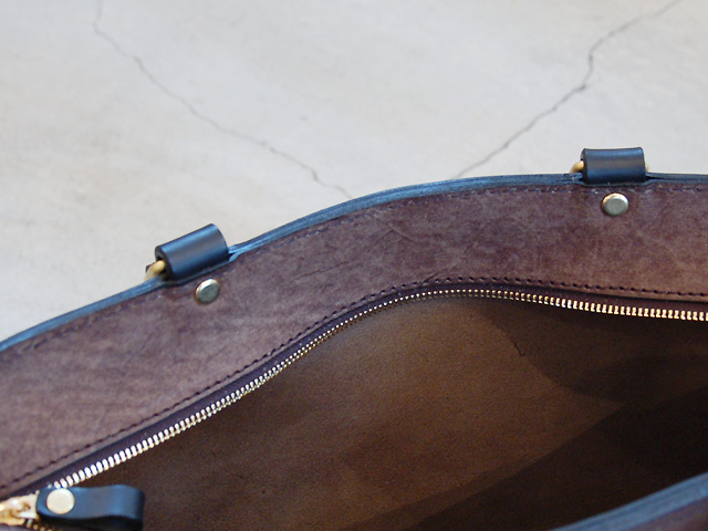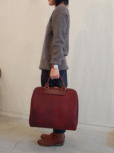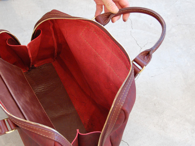 底部分まで両開きのファスナータイプ。革の質感と形の意外さが魅力です。