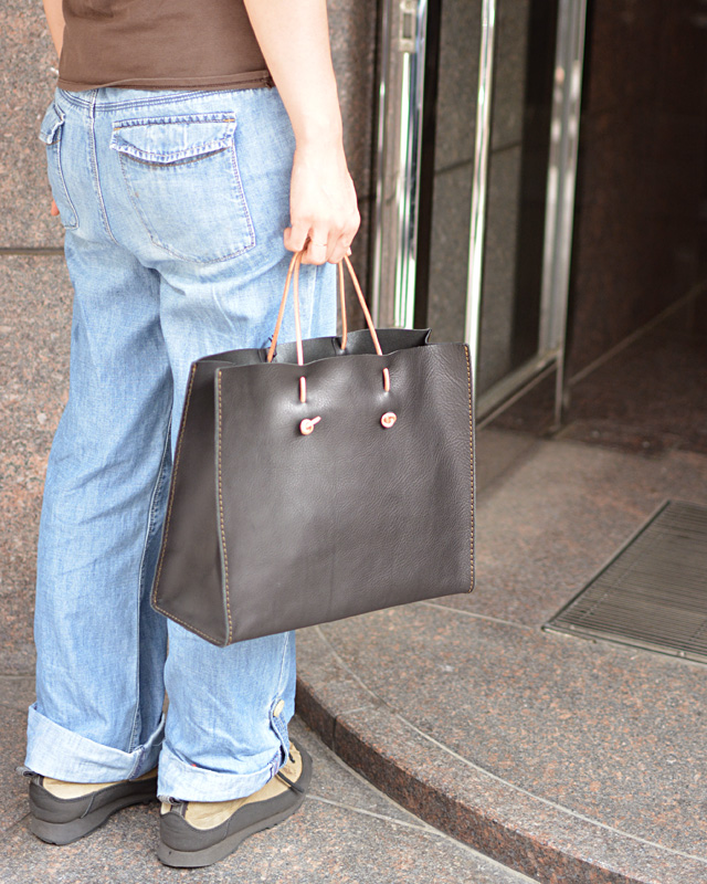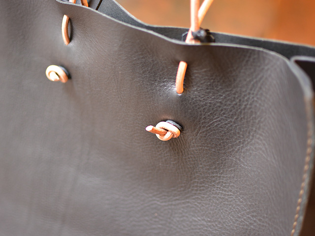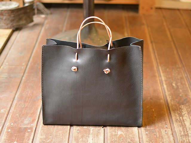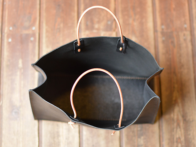 革は薄めのソフトレザーを使い、取っ手はカバンに仕舞う時に