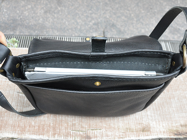 ショルダーバッグ本体蓋を開けると、前面にも盤面サイズのポケットが付いていて