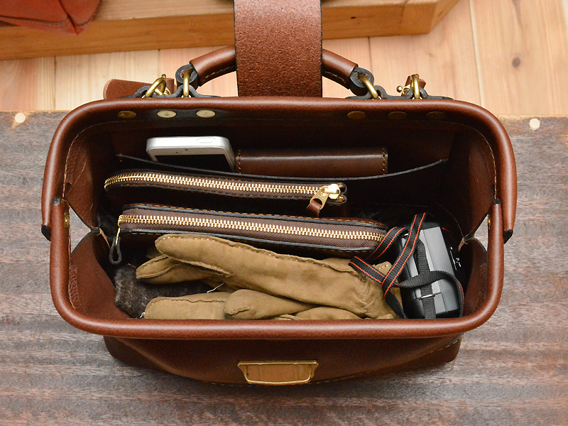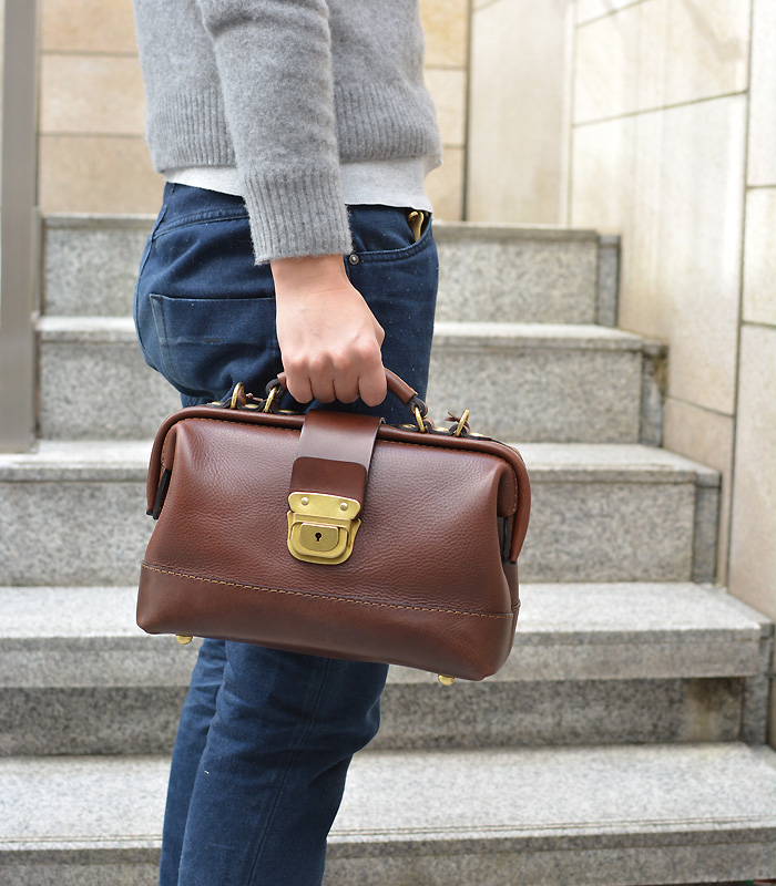 ワンタッチで使える錠前をつかった口枠鞄です。