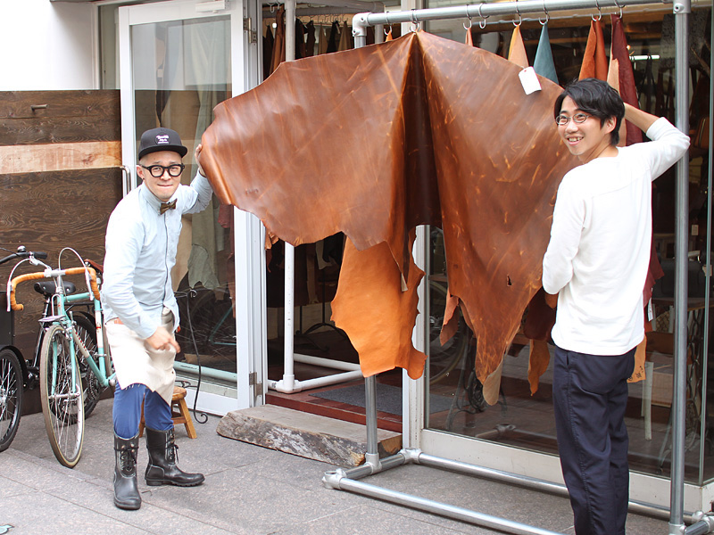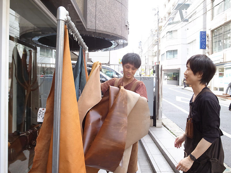 こんな感じで外に一枚革を吊り下げて販売しています。