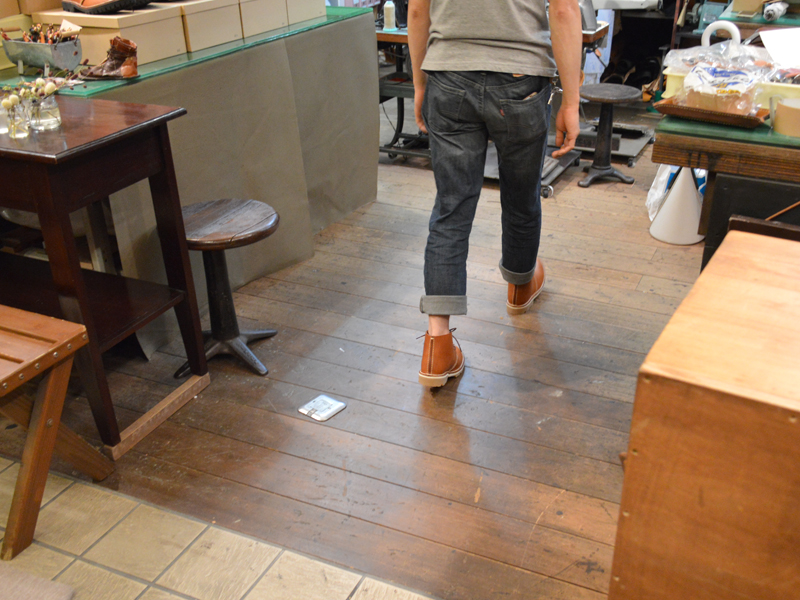 石口「長さに対して幅は細めに作ってあるんですが、ではもう一つ下のサイズも履いてみましょう。」