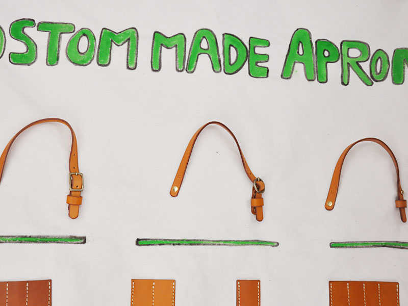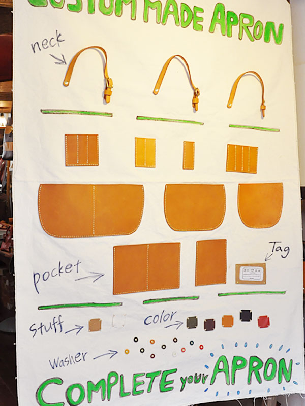 こちらのエプロン、ベースの形に自分の好きなポケットや革の色を組み合わせ