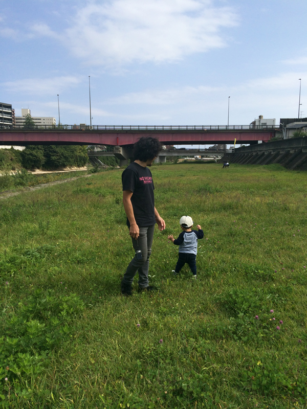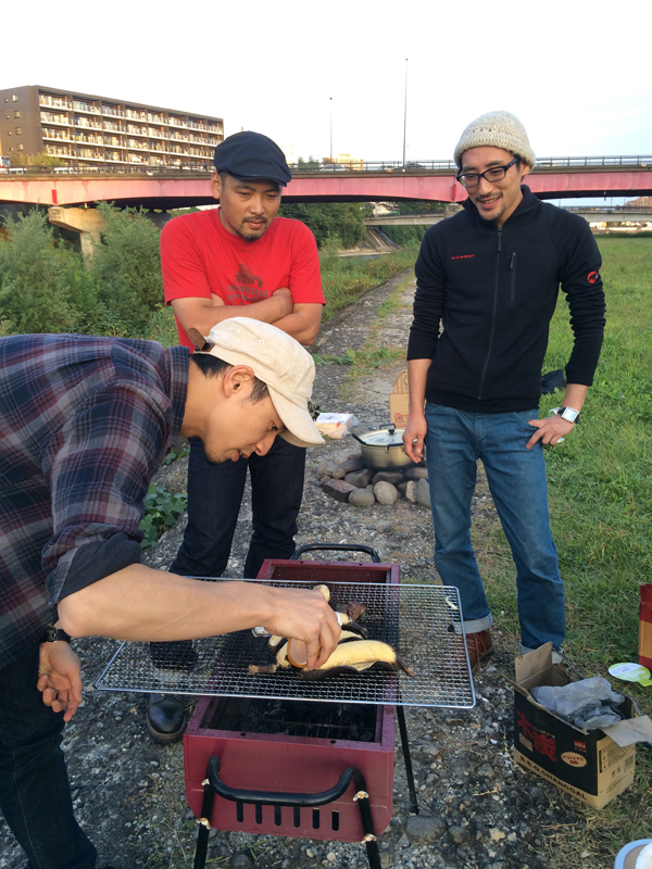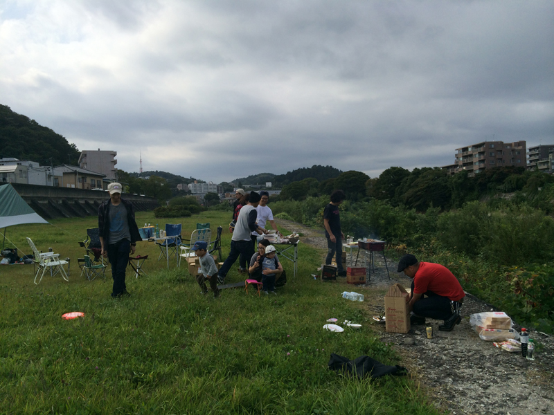 いつもの河原でタープを張り、イスとテーブルを並べ…
