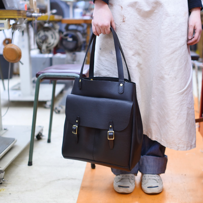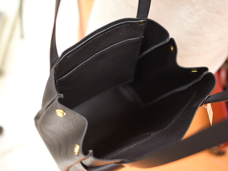 縦長のトートに合わせたカブセ付きのダブルポケット。