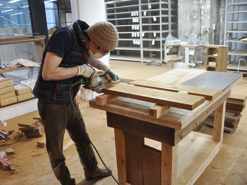 野口がマンツーマンで機材の使い方から、什器の作り方まで、教え込んでいます。