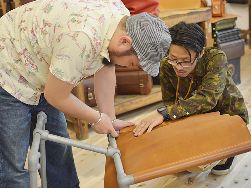 ディスプレイの椅子の修理に苦戦する、男二人。