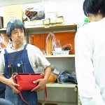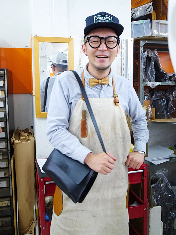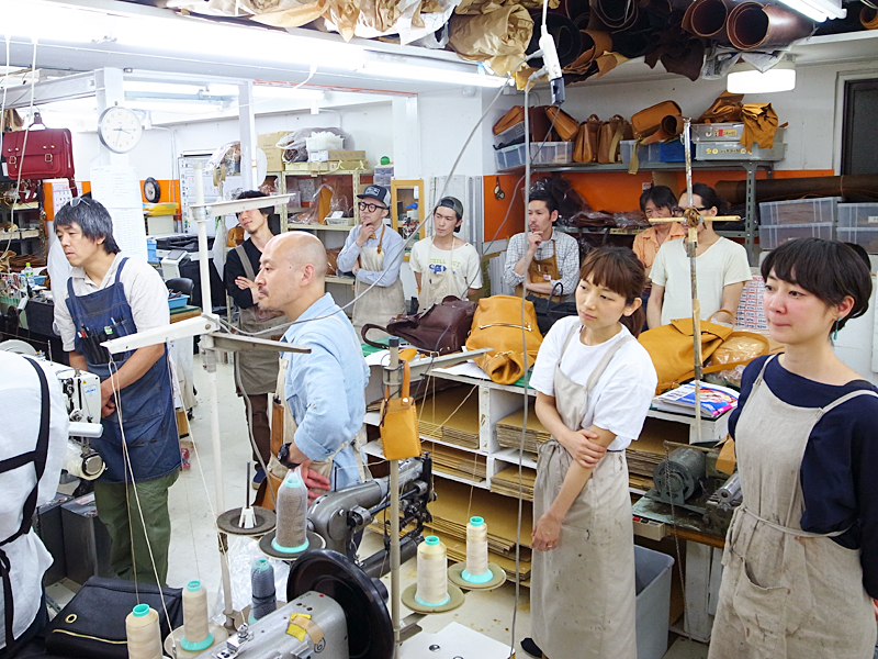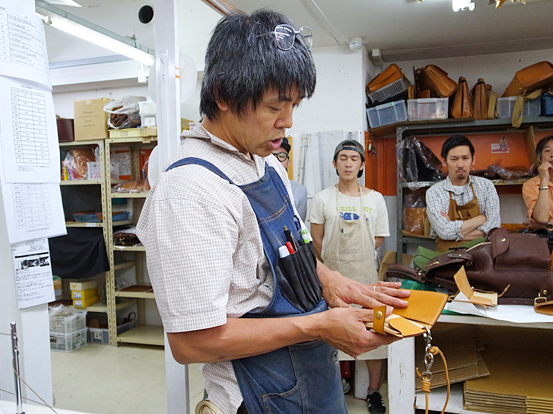 「お札入れの革紐が気になる!」と囲まれる作り手:鈴木。