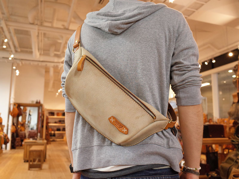 秋のお出かけにもピッタリな人気の「立体マチ・ボディバッグ(F-5)」をアラスカ革特別仕様で作ってみました。