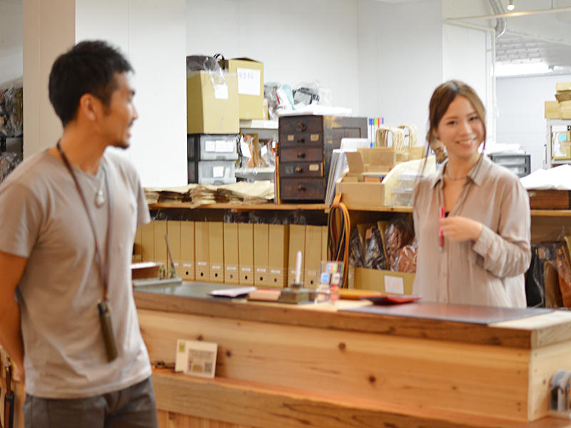 初めての本店に興奮の様子で「こういう見せ方もあるんですね!」とディスプレイについて高橋に色々質問中。