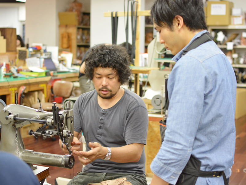 革を広げながら、基本となる革の取り方から丁寧に教える師匠:西川。