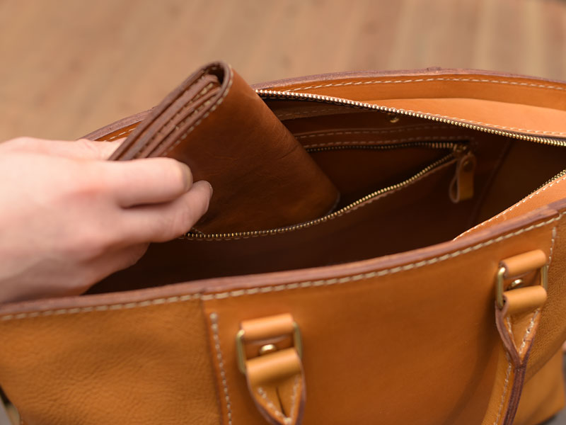 中央と底の部分にはラティーゴ(ハードレザー)を使用し、ガッチリさせて型崩れを防ぐようにしています。」