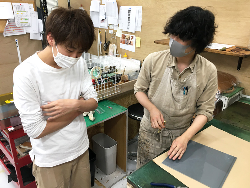 工房で私の前で制作をしている今瀬氏。