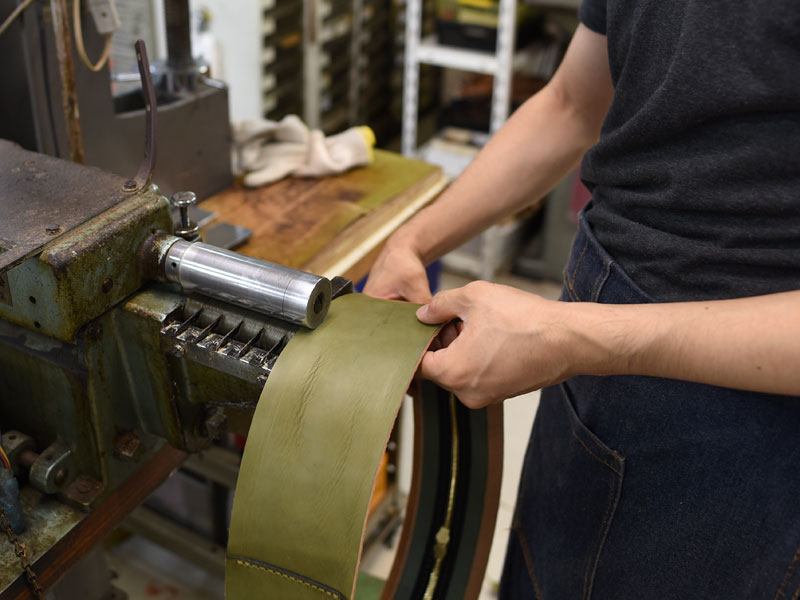 「まず目を引くのが、鞄の顔にもなっている太い一本ベルトだと思います。試作の段階で最も悩んだ箇所であり、ファーストサンプルでは錠前を使っていました。ただ、強度や見た目のインパクトに欠ける部分もあったので、この仕様に決定しました。ヘルツではよくあるタイプのベルトですが、下の差し込み金具で開閉しやすく、このバッグにも合っていると思います。」