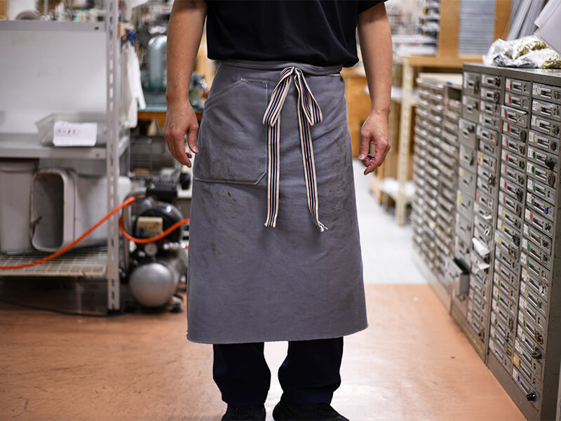 以前使っていたエプロンの腰紐を再利用し、やや厚めの8号帆布を使って自作しました。