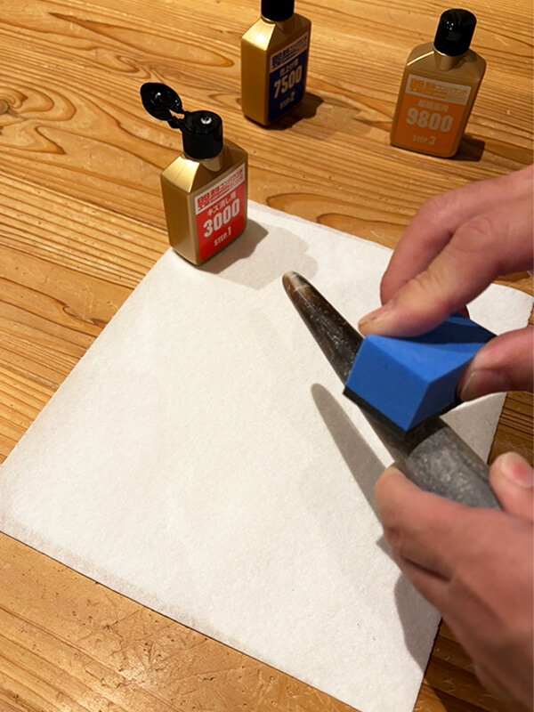 道具とはちょっと違いますが、入社したての頃、手の汗で革を汚し、ひどく怒られた事を今でも憶えています。ハサミで手を切ったり、ハンマーで叩くことも何度もありました。