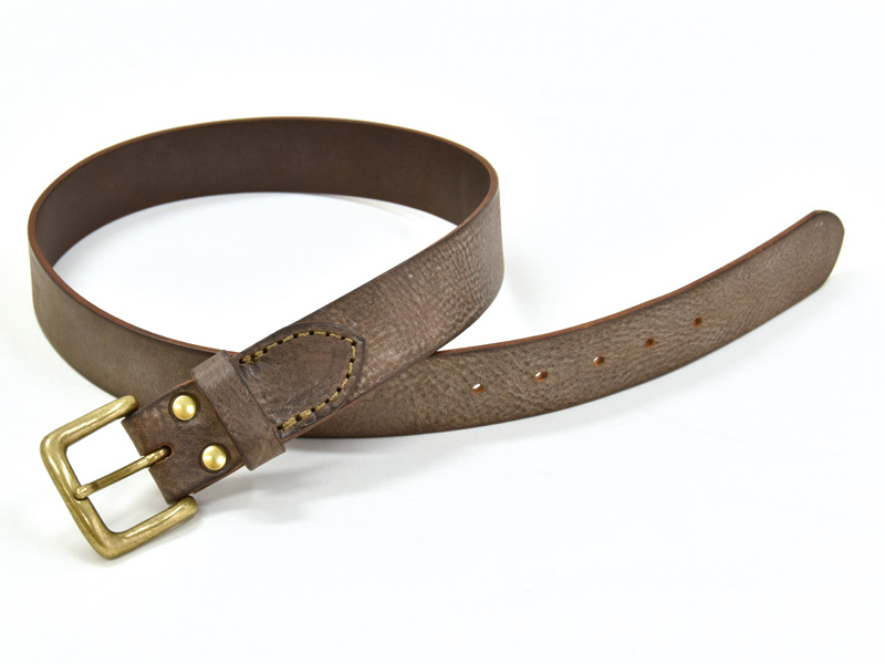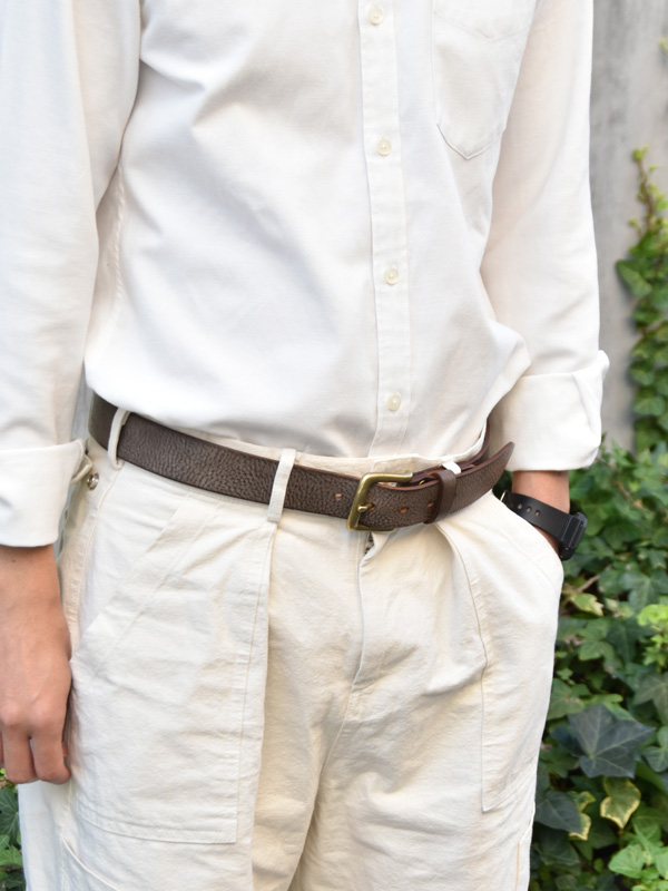 大きな真鍮バックルと35mm幅でおつくりする、存在感のあるベルトです。