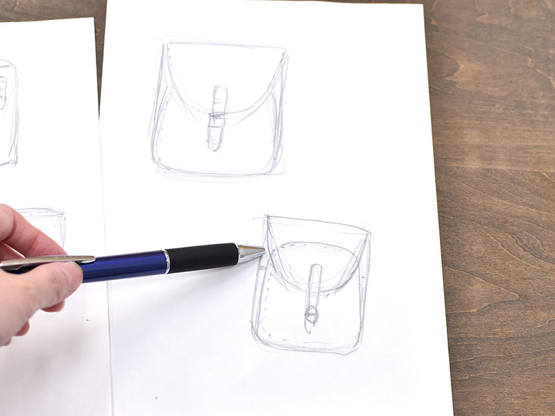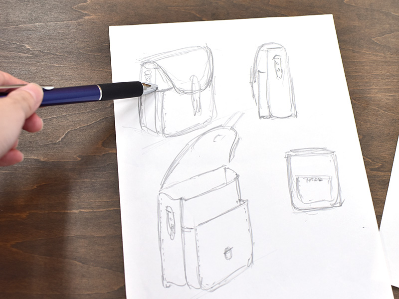 「そうだね。なんとなく手が動いて絵描いていて、これ作ってみようかなってなることが多いね。今回は、中の荷物を保護するような、外は固くて中が柔らかい鞄をイメージして作りました。中は内縫いでふんわりさせて、外側は厚みのあるハードレザーの外縫いでラップ構造にして、包み込むような感じかな。」