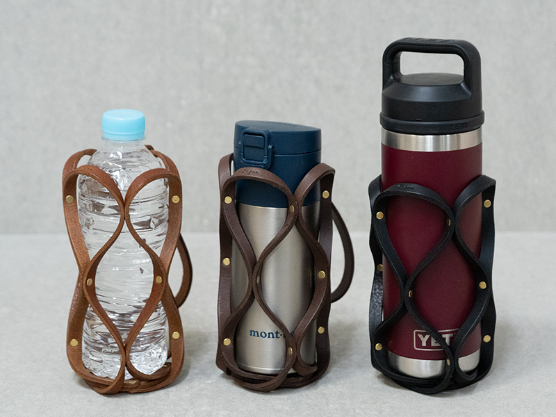 革の帯を組み合わせたシンプルな構造ですが、軽く、丈夫でしっかりとボトルを包み込むのため、日常使いからアウトドアシーンにもおすすめです。