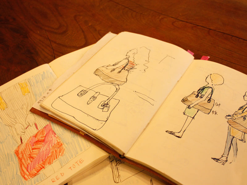 (実際の青木によるスケッチ。鞄作りには欠かせない作業の一つ。)