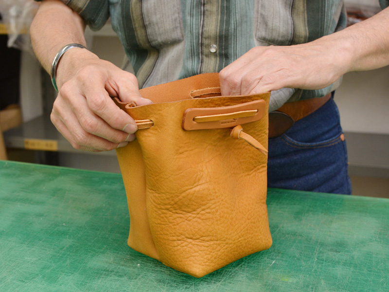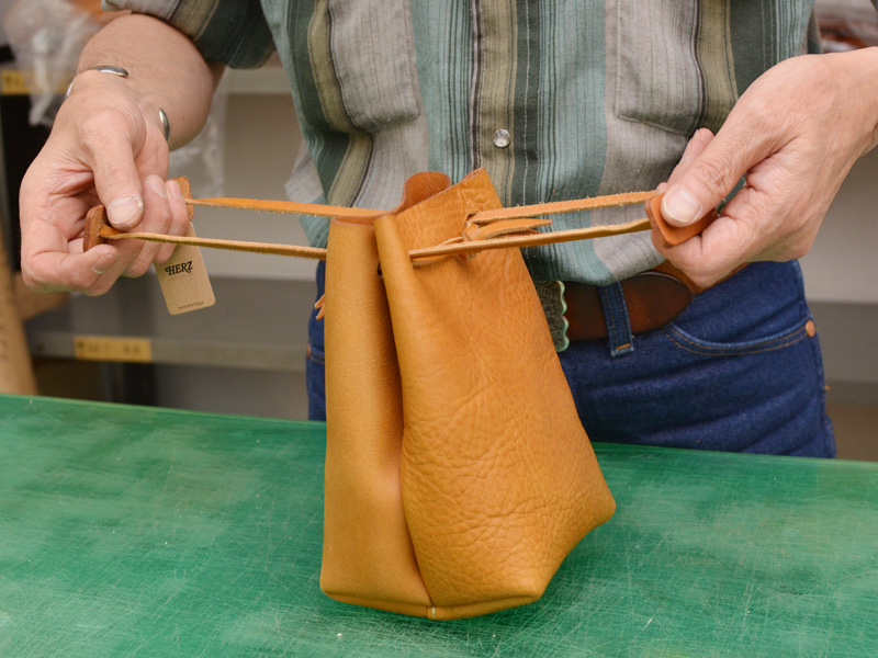 革紐の厚革部分は、手で持っても、革紐留めとして本体の方へ留めてもどちらでも自由に使えます。