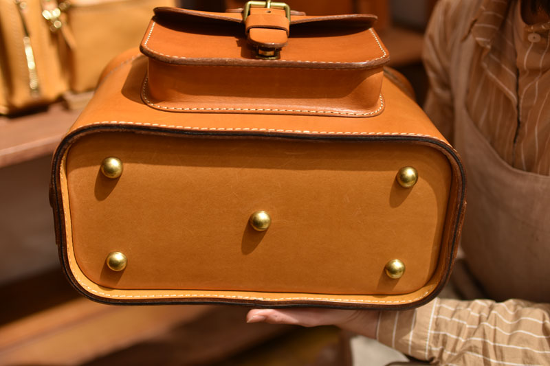底板(鞄の底に入れている硬めの板のこと)がついている鞄は、底鋲と一緒に固定することで、底板が動くのを防ぎます(ヘルツの鞄の中には底鋲がついていても、底板が固定されていない鞄もあります)。