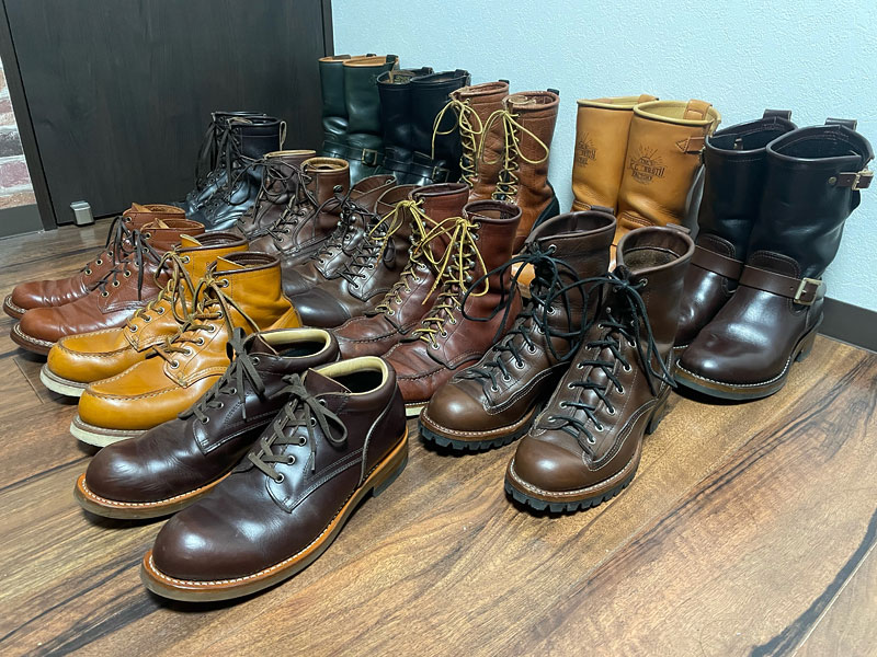 大学生の頃にレザーワークブーツにハマった事をきっかけに、ズブズブと革の魅力に沈んでいきました・・・。元々収集癖があったので、今ではこんなことに・・・。