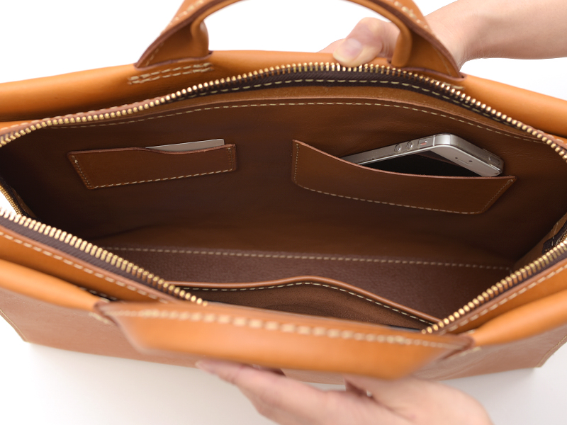 こちらは鈴木自ら考案した、ハードレザーのかっちりとした2wayビジネスバッグ。お客様の声を参考にしたというだけあって、機能性もばっちり。