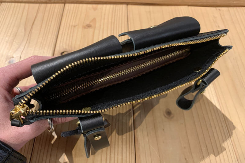 メイン収納部のサイズ感としては、ファスナー長財布(WL-58)をすっぽり収まりつつも、上の方のスペースにはまだ余裕があるくらいの大きさです。