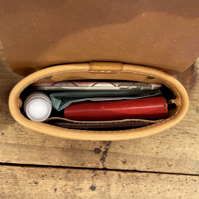最低限お出かけに必要なものはしっかり入る大きさです!内側にはポケットがついているので、定期券やカードキーを収納できます。実際に収納してみると、思った以上に容量があります。