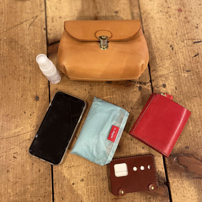 二つ折り財布、定期券、携帯電話(iPhone11)、エコバック、消毒液。ちょっとおでかけするには十分な容量ですよね。