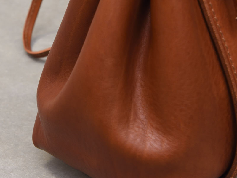 優しく弧を描く形状が印象的で、革の風合いと相まって、可愛らしくも落ち着いた大人の雰囲気のあるショルダーバッグに仕上がっています。