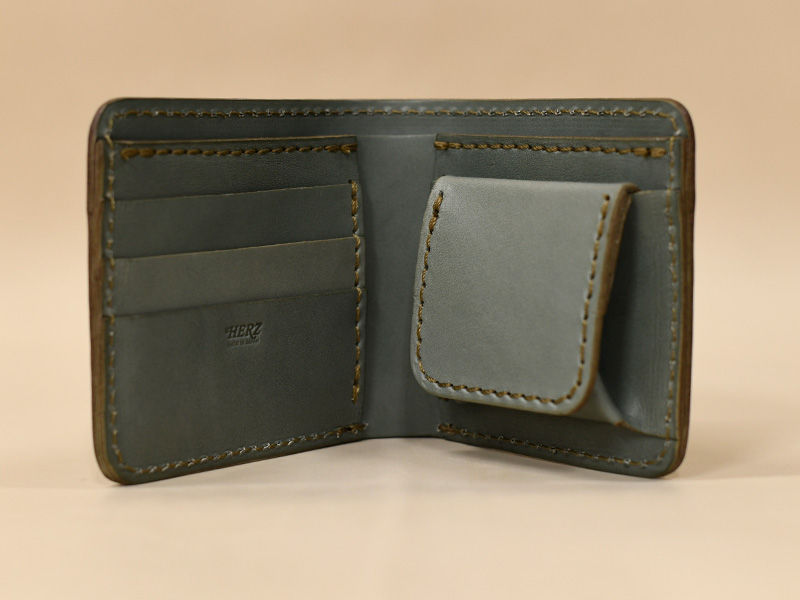 内部に差し込みポケット、逆側にはカードポケットが付いています。カード等の「アタリ」がでるので革製品らしい経年変化が楽しめると思いますよ!後面にはヘルツ刻印が見た目をキュッと締めてくれています♪