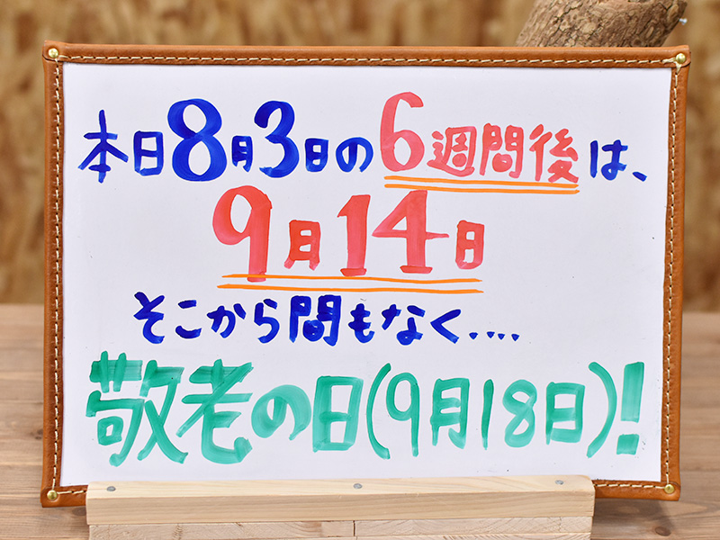 本日、8月3日の6週間後は9月14日。プラス4日後には敬老の日(9月18日)がやってきます!