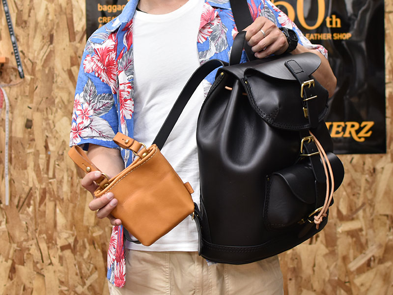 画像左のキャメルのアイテムが大工さんの腰袋的ベルトポーチ(E-27)、画像右のブラックのリュックは迫力のWポケットリュック(R-9)です。