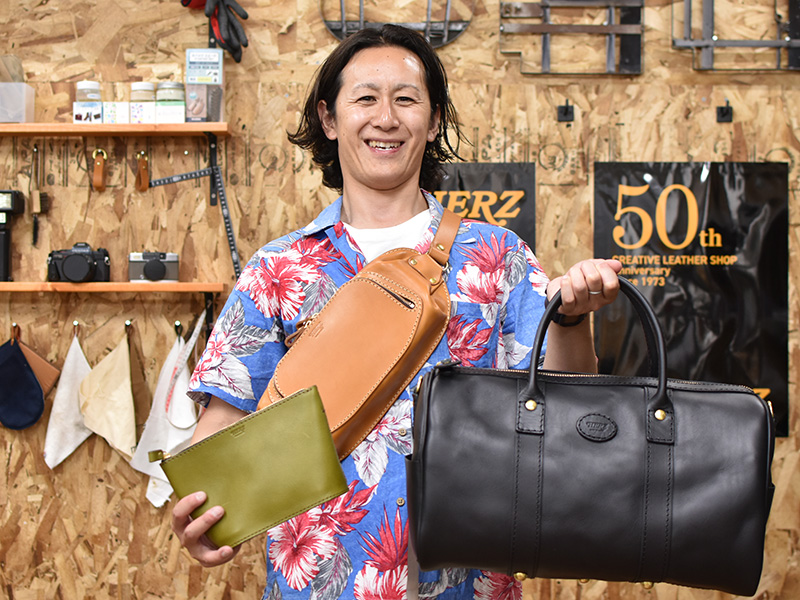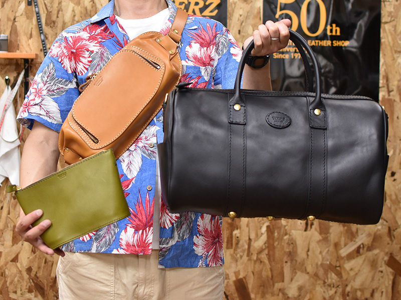 左から、グリーンのアイテムがスタンドポーチ(KF-1)のMサイズ、キャメルはラウンドファスナーボディバッグ(F-7)、ブラックがファスナータイプ・ボストンバッグ(V-23)のSサイズです。