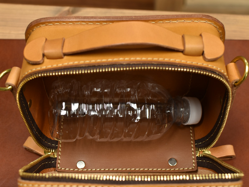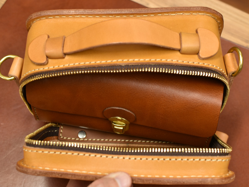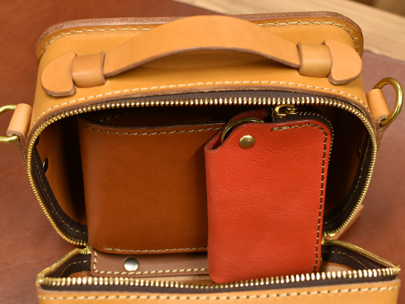 ハードレザーで作るボックスタイプのバッグはレトロ感漂う見た目で、盤面に使われている一枚の革は素材の良さを充分に楽しめます。