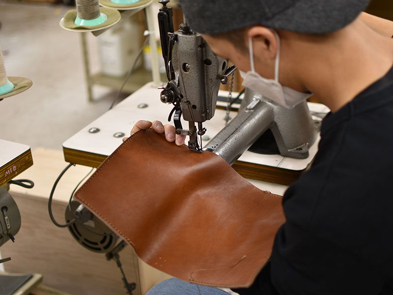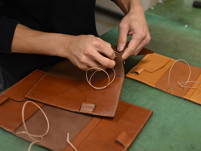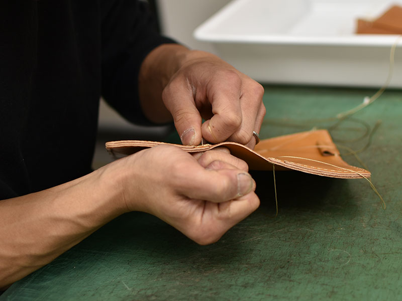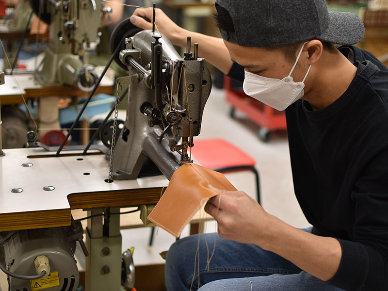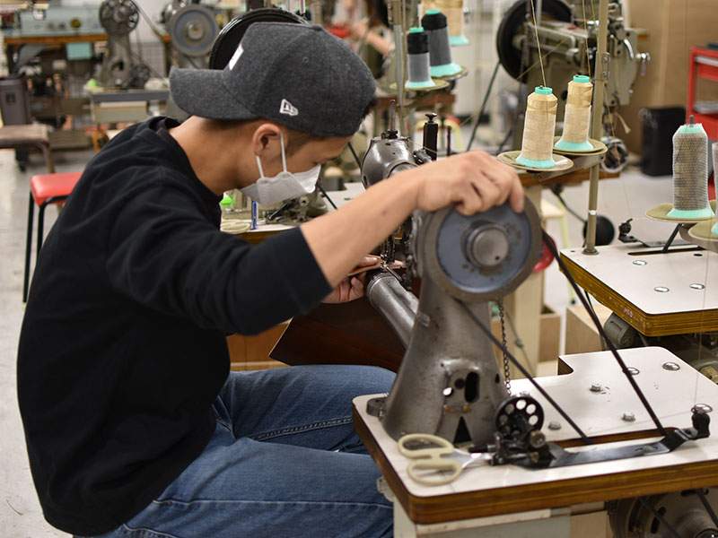 パーツを仮留めしたら、縫い付け。シンプルな構造でステッチが印象を左右します。真剣そのもの。