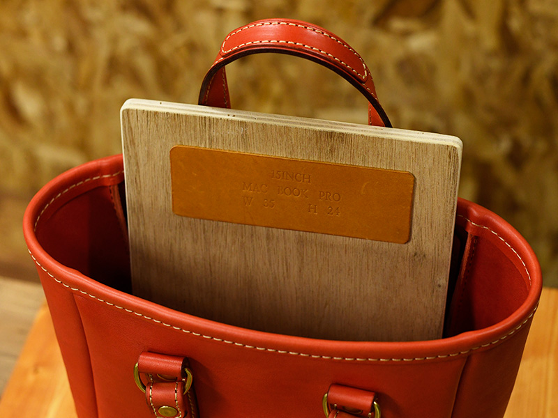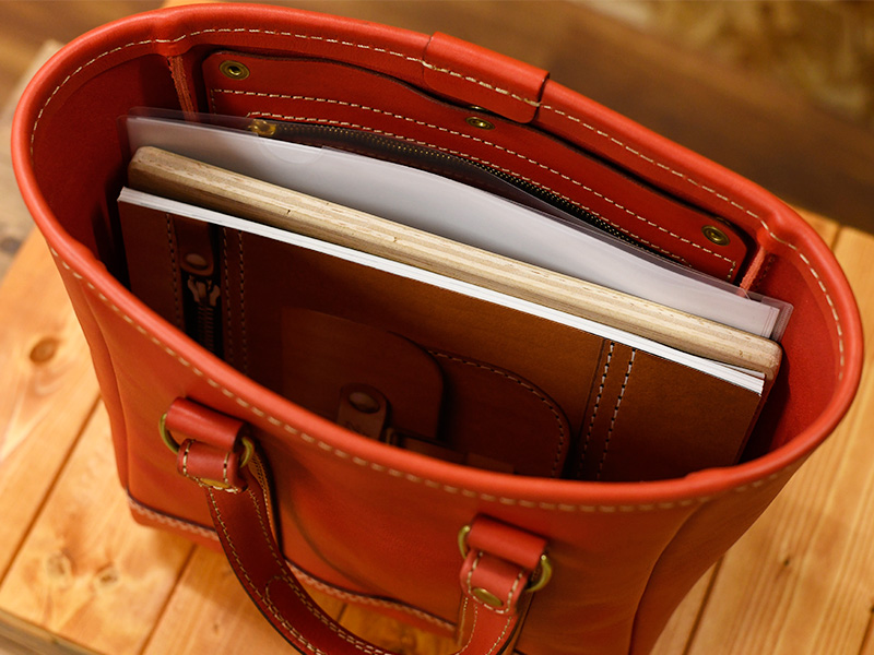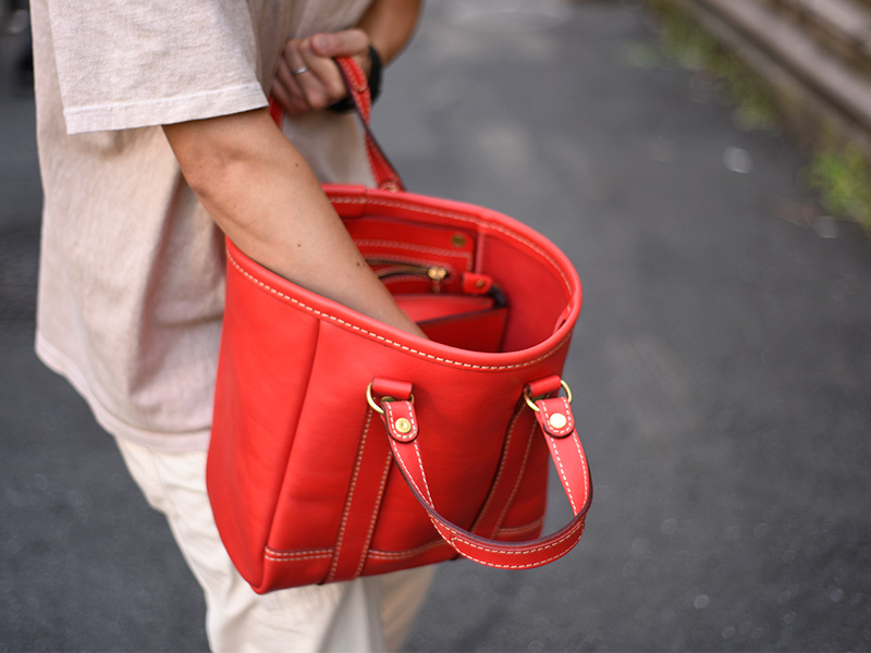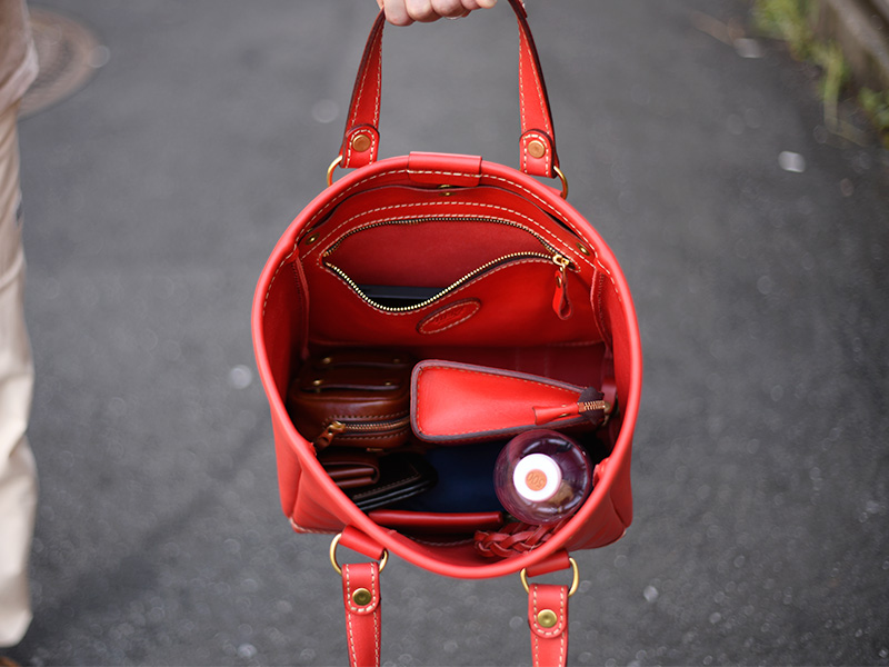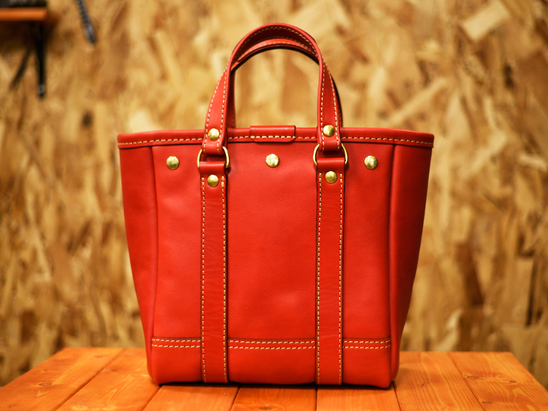 バケツ型トート(T-70)のSサイズ。革色はレッドを選びました!