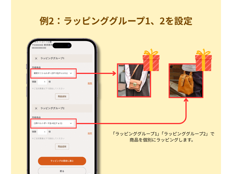 ・例2→ラッピンググループ1、ラッピンググループ2にそれぞれ含んだ商品を個別にラッピングします。