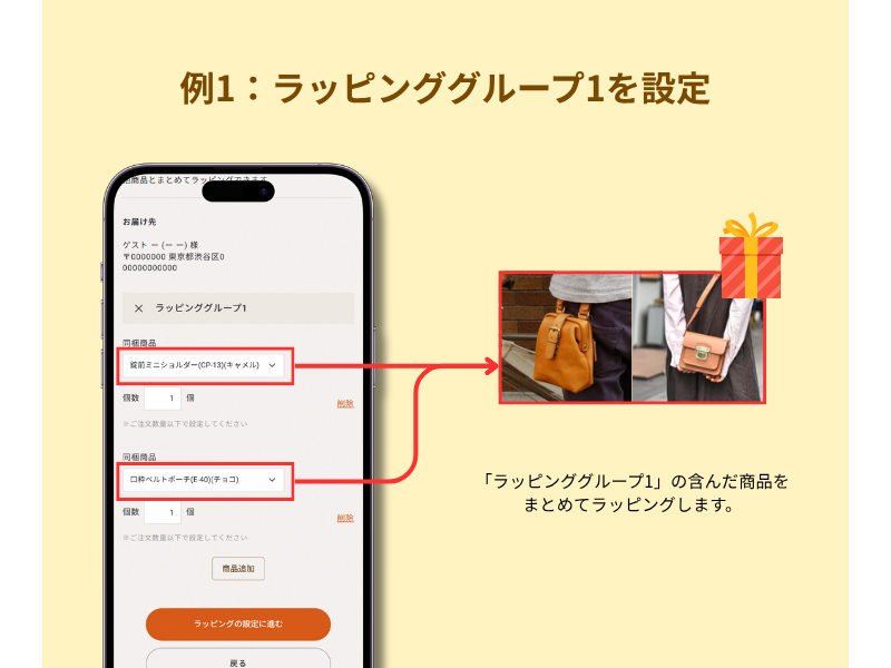 ・例1→ラッピンググループ1に含んだ商品をまとめてラッピングします。