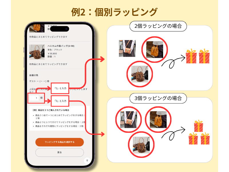 例2:個別にラッピングをご希望の場合→2、または3と入力