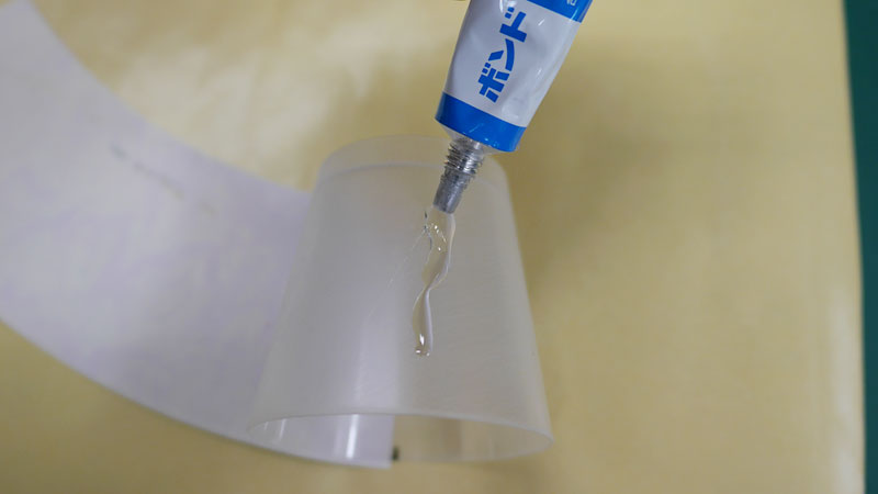 ヤスリ掛けが出来たら、カップの内側の上下1か所にマジックで印を付けて、表面に透明のボンドを塗ります。素早くヘラで均等に伸ばしたら、マジックで付けた印の所からグルっと紙を貼っていきます。