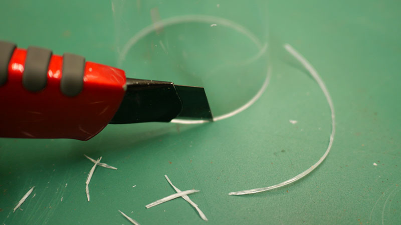 重なった部分は、ランプにのせて点灯すると重なりの境目が見えるので、慎重にカッターでなぞって切ります。