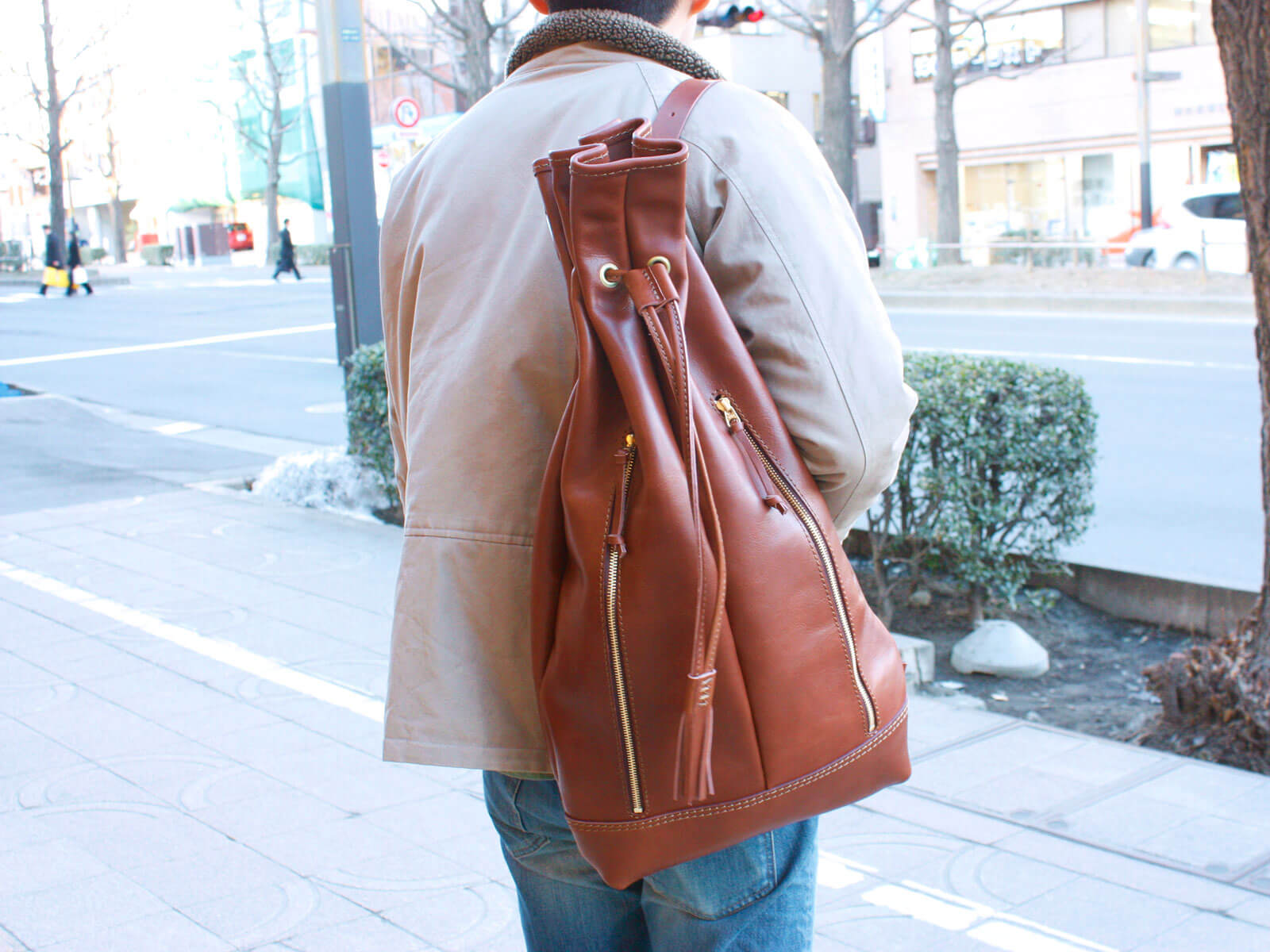 『曲線を多用したまるっとしたフォルムのリュック。』 ソフトレザーの柔らかさと曲線的なフォルムにより、丁度よいフィット感を生みだすことに成功しました。革を折り込む・絞る・膨らませるつくりが散りばめられ、色々な革の変化を楽しめます。